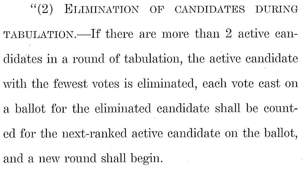 However, one small tweak to the legislation would transform this great bill into a fantastic bill. The Tabulation Process describes the instant runoff tabulation method, whereby in each round, the active candidate with the fewest votes is eliminated. This method can be problematic because it can lead to the elimination of a candidate with broad support in an early round. This is described in Section 331 (2) of the bill:
